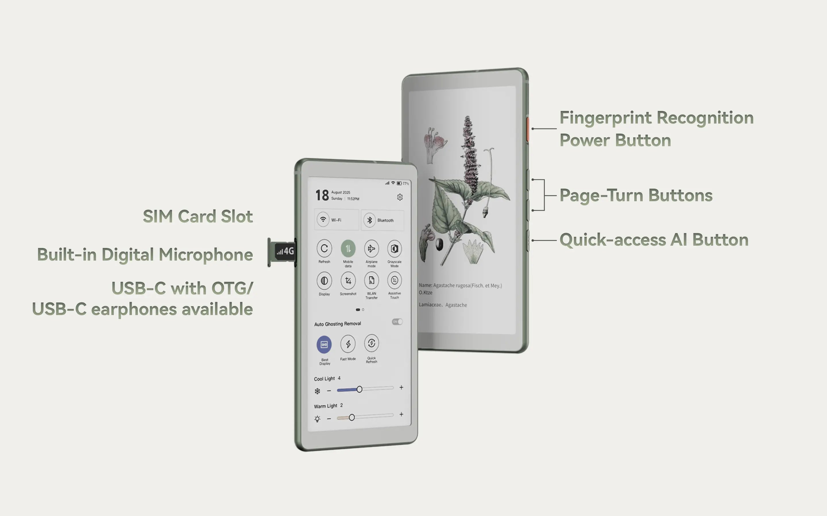 Viwoods AiPaper Reader Color is a pocket-sized color ereader for charts, comics, and focused reading with on-page AI help. It runs Android 16 and uses a 6.13-inch Kaleido 3 E Ink display (824×1648, 150 PPI) with dual front lights (adjustable brightness/temperature), plus a 6nm octa-core CPU, 4GB RAM, and 128GB local storage. Designed for commuters and students who want color reading without glare. Buy from Viwoods UK: VAT included, 60-day satisfaction guarantee with free returns, and localised customer support.